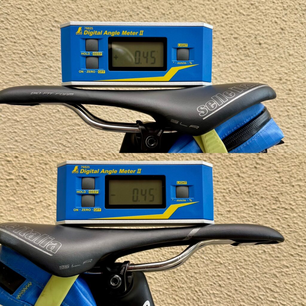 左右を入れ替えてもう一度測り数値を確定させます。これにより地面の水平に惑わされること無くサドルの水平を測ることが出来ます。