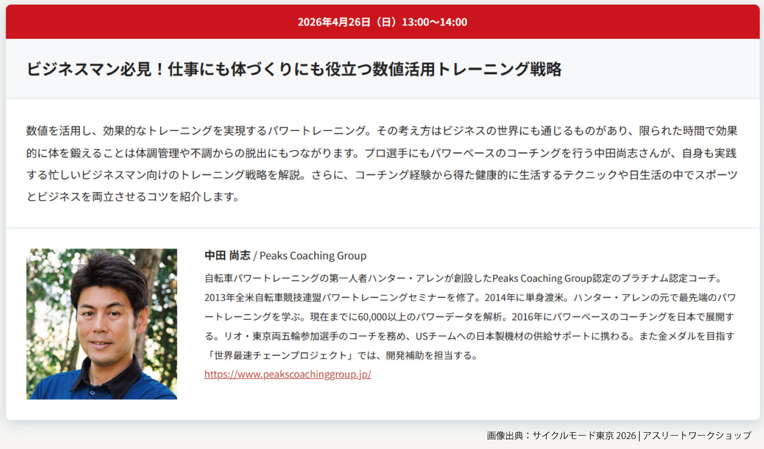 そんなサイクルモード東京の人気コンテンツ「アスリートワークショップ」に、今回も中田コーチが登壇いたします。