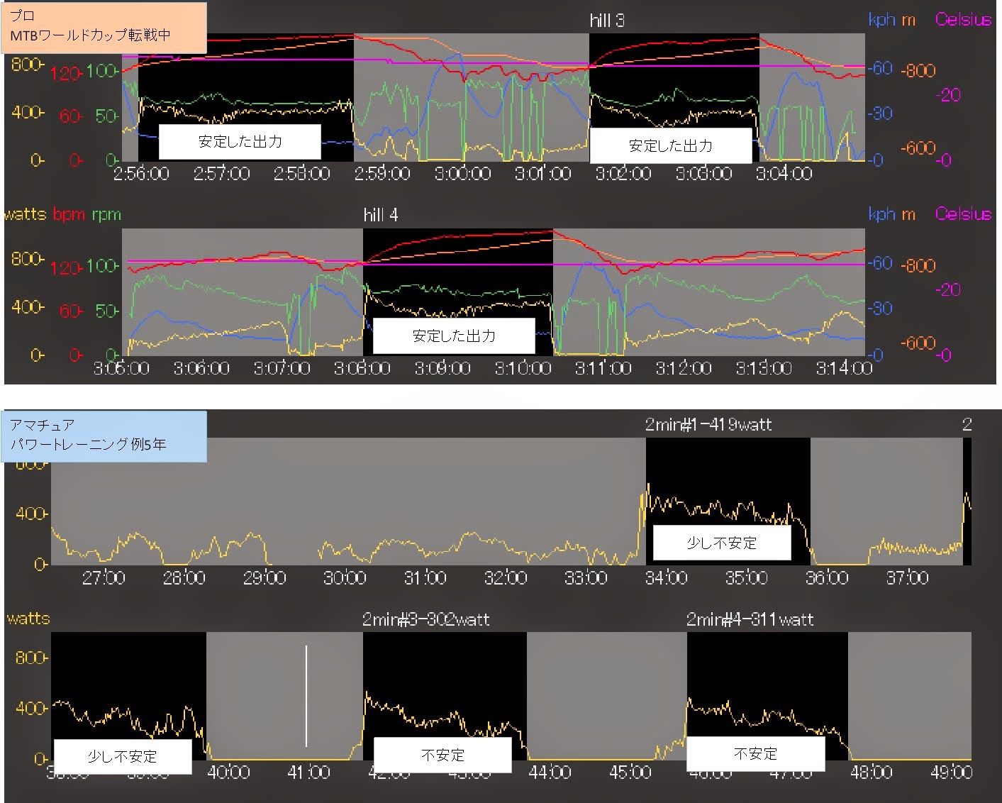 画像の上半分がMTBワールドカップを転戦しているプロサイクリストのパワーデータで、下半分がパワートレーニング歴5年のアマチュアサイクリストです。