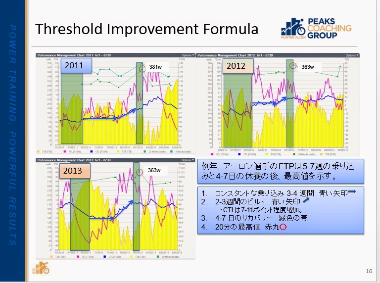 その結果、アーロン選手はトレーニングで2013年8月1日に20分の自己ベスト363wattsを叩き出し、レースでは個人タイムトライアルで優勝しています。
