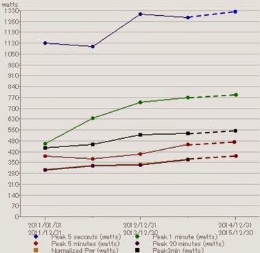 パワーデータを参照して、2013シーズン、2014シーズンを比較し各パワーゾーンの伸びをチェックします。そこから2015シーズンはどこまで伸ばしたいのか?伸びるのか?ゴールを設定します。